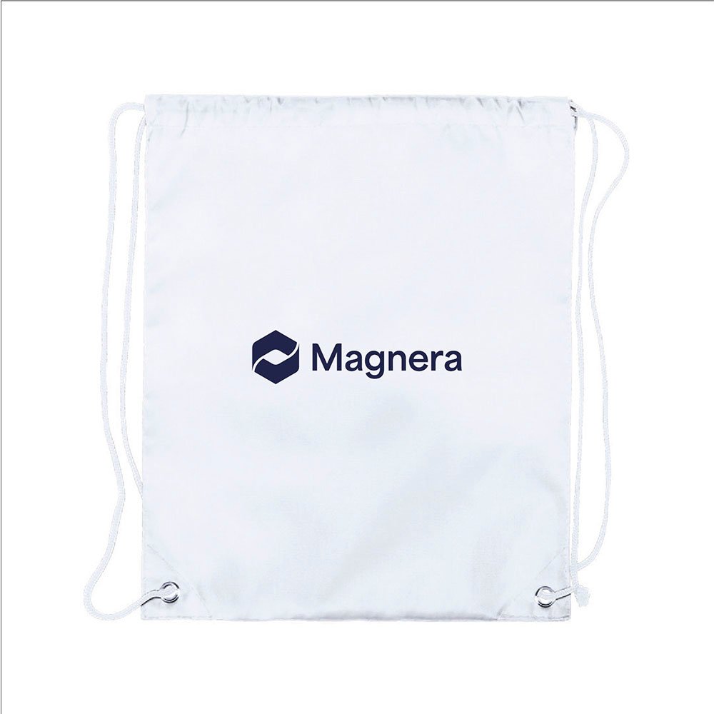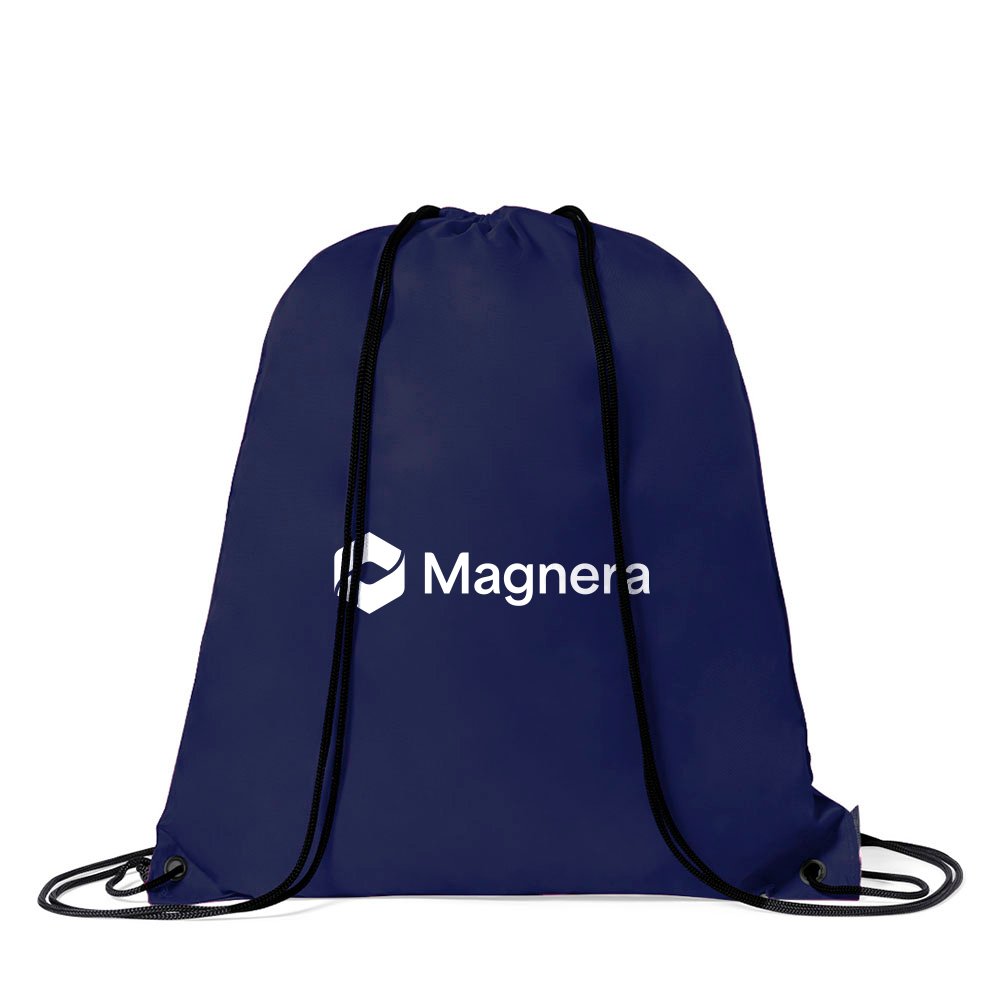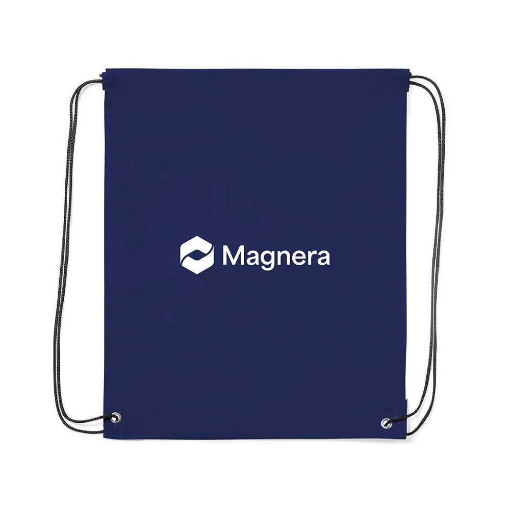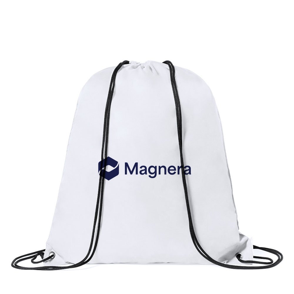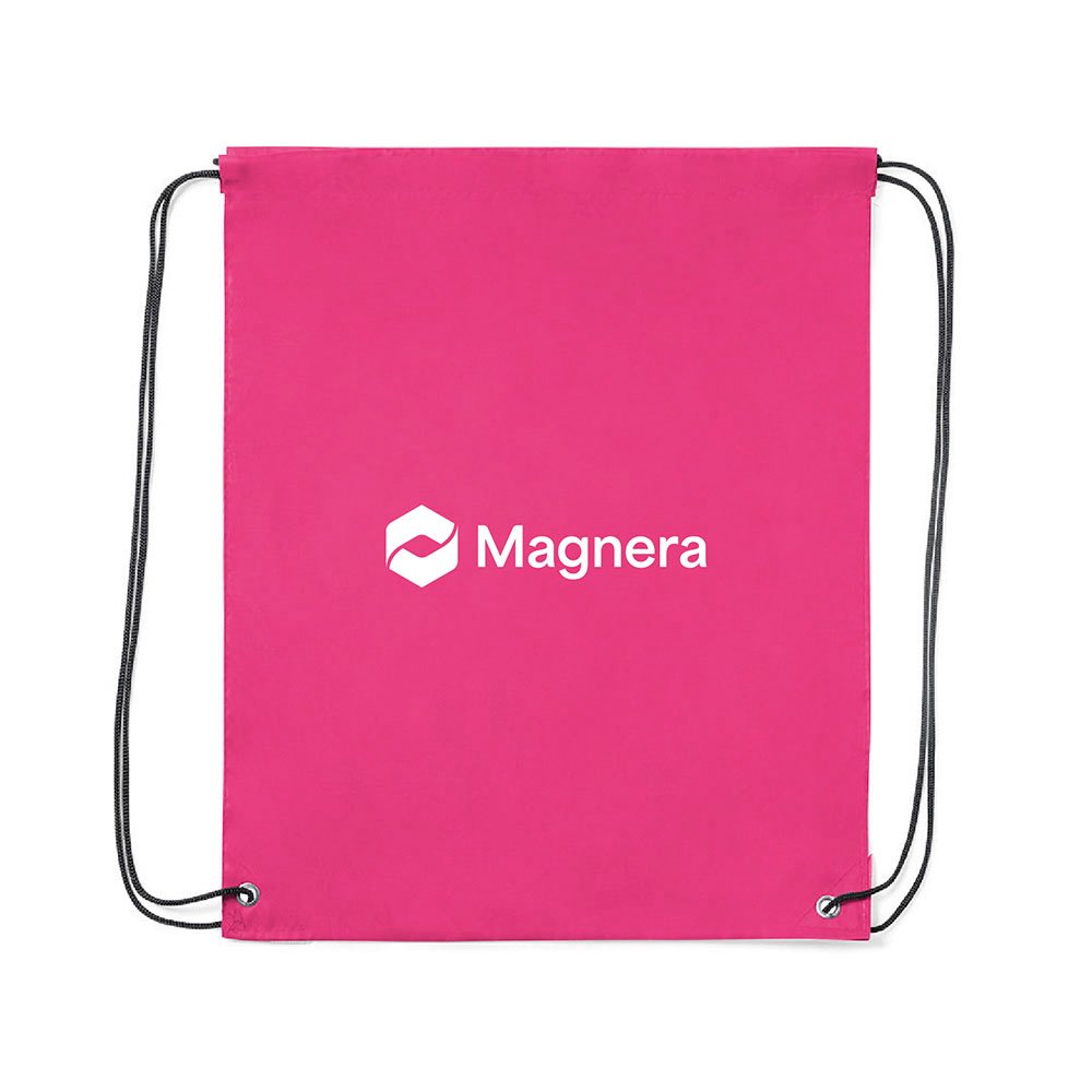 Lightweight drawstring backpack made from soft 210T polyester. Features black self-closing cords, reinforced corners with matching PU leather accents, and durable metal eyelets for added strength.