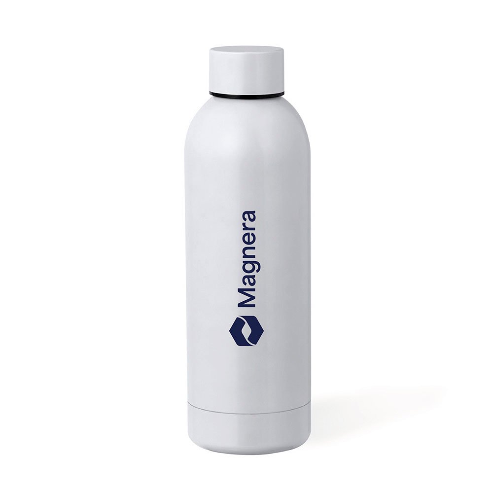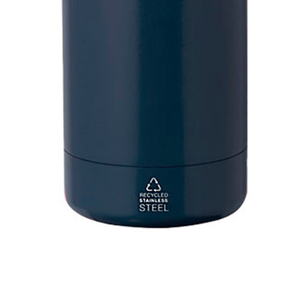 Eco-friendly 550ml thermal bottle made from recycled stainless steel in a double-wall design for optimal temperature retention. Finished in a matte metallic color, it includes a subtle Recycled Stainless Steel logo.