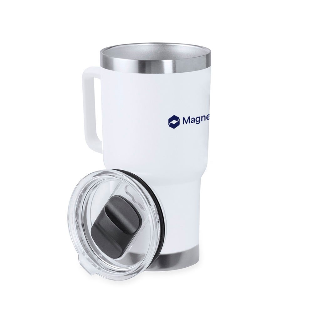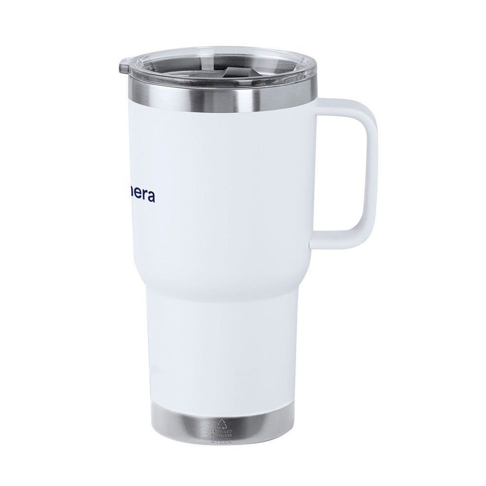 600ml matte-finish insulated mug crafted from recycled stainless steel. Featuring a durable double-wall design to maintain drink temperature, it includes a secure snap-on lid with an easy-open dispenser and a sturdy handle for added convenience. Features a Recycled Stainless Steel logo, reinforcing its sustainable design.