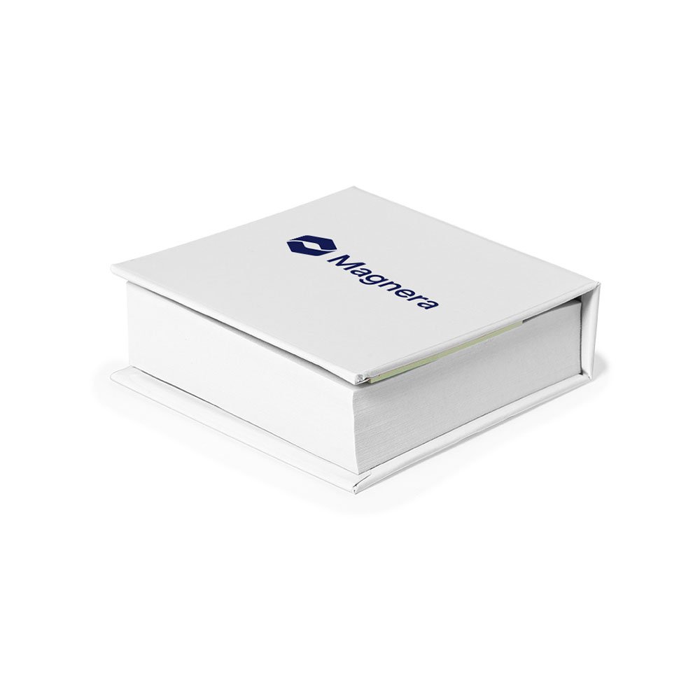 Vibrant notepad holder, featuring soft-touch covers made from durable, glossy rigid cardboard. Includes 200 blank sheets (7.6 x 7.6 cm) and 125 mini sticky notes (1.5 x 5 cm).